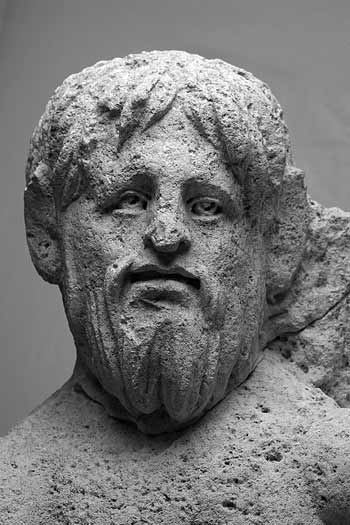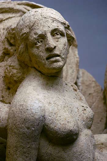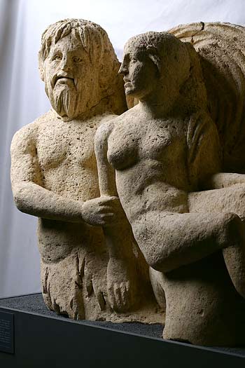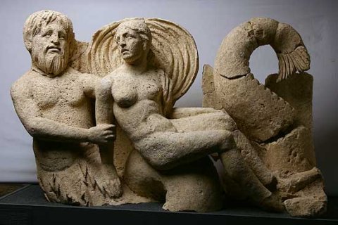 - Mythische Figur, Meerwesen: nach links schwimmender bärtiger Triton mit leicht zurückgewendetem Oberkörper, hält mit der Rechten den Arm einer auf seinem Fischleib reitenden nackten Nereide, hinter deren Kopf sich ihr Mantel bläht.