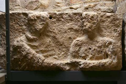 - Ehepaar (Familie ?) : Oberkörper von zwei stehenden bekleideten Ganzfiguren, links Frau, rechts bärtiger Mann, in der Linken Rolle (volumen ?). Unter der nach rechts gestreckten Hand der Frau Rest eines Kinderkopfes ?