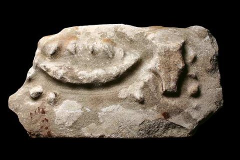 - An Bukranion aufgehängte Girlande mit Tänien. Im Girlandenbogen Reliefreste.