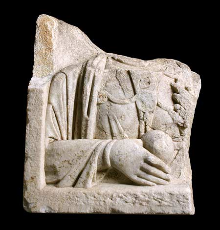 - Linke Seite einer Rechtecknische mit Brustbild einer einheimischen Frau mit Brustschmuck, Fibeln, auf der Brust kleine Fibel, Halsreif, Armreif, Umhang, in der Rechten Apfel. Vermutlich Ehepaar.