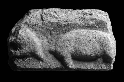 - vierfüßiges Tier (Schwein) nach rechts, von weiterem, nach links gewandtem Tier nur Hinterteil erhalten
