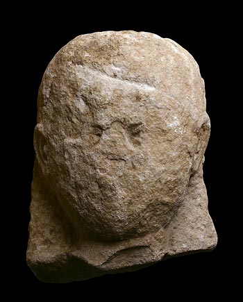 - Kopf eines bartlosen (?) Mannes. Teil eines Grabreliefs.
