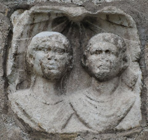- In Muschelnische zwei Büsten (Ehepaar). Links Frau: Frisur der Agrippina Minor, Halskette, Mantel. Rechts Mann: bartlos, glattes Haar, Mantel (Sagum ?).