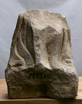 - Links Falten eines Gewandes, rechts davon abgeschlagene Rahmenleiste (?), rechts Reliefreste.