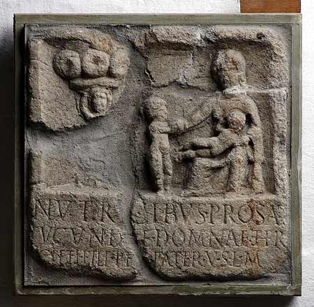 - Mythische Figur : Weihinschrift, darüber einfach gerahmtes Bildfeld mit rechts sitzender Nutrix mit Kind auf den Knien. Vor ihr stehendes Kind, links stehendes Mädchen mit Schale mit drei Broten auf dem Kopf.