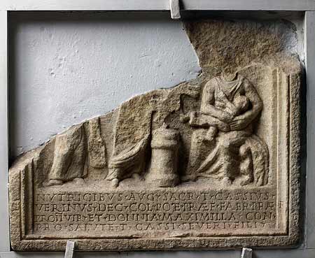 - Mythische Figur : Tafel mit Profilrahmen und Weihinschrift unter dem Relief. Rechts sitzende Nutrix mit Kleinkind in den Armen, vor ihr zylindrischer Altar, links davon zwei stehende Frauen.