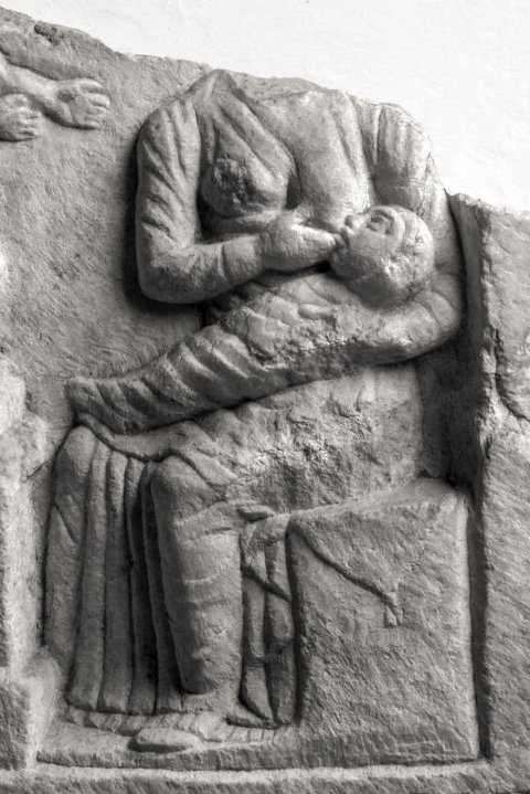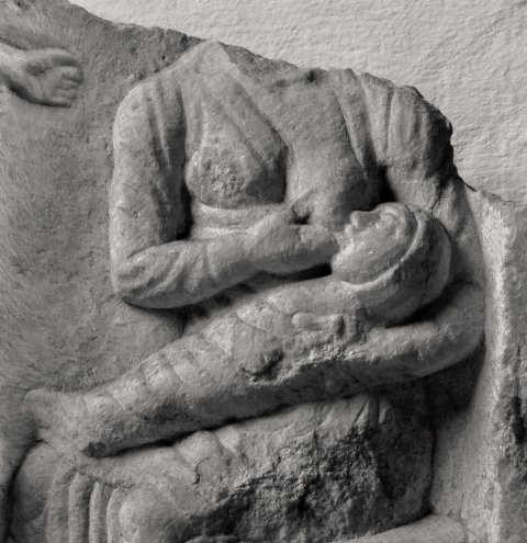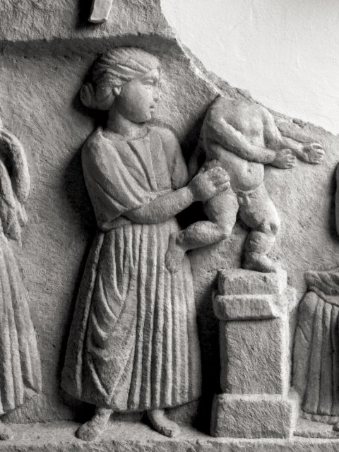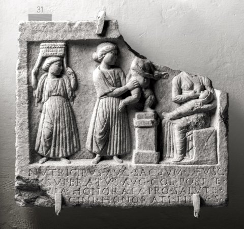 - Mythische Figur : Einfach gerahmtes Bildfeld mit Weihinschrift unten. Rechts sitzende Nutrix, die ein Wickelkind stillt. Vor ihr Altar, über den eine Frau ein nacktes Kleinkind hebt. Hinter ihr Mädchen, das mit beiden Händen einen Korb auf dem Kopf hält.
