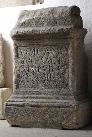 - Volcano / Aug(usto) sacr(um) / ex imp(erio) vicus / Fortun(ae) a templ(o) / Fortunae ad horr(ea) / m(ille) p(edes)