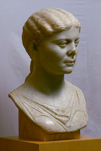 - Bekleidete Büste einer Frau mit gescheiteltem, gewelltem Haar, das im Nacken zu einer Schlaufe zusammengefasst ist (Prinzessin aus dem julisch-claudischen Kaiserhaus ?).
