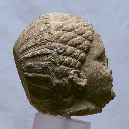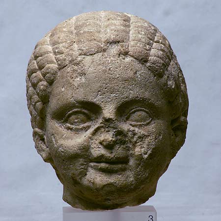 - Porträtkopf eines kleinen Mädchens mit Melonenfrisur. Scheitel quer über den Kopf, am Hinterkopf stilisierte Haarsträhnen.