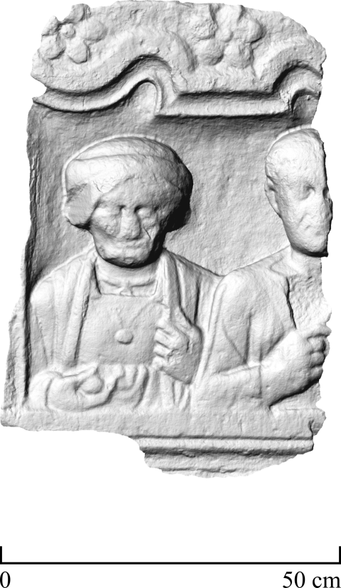- In Nische mit geschwungenem oberen Rand zwei Brustbilder (Ehepaar). Links einheimische Frau: Haube, gegürtetes Gewand, Umhang, Flügelfibeln, Brustschmuck mit einer Scheibe, Halsband mit Lunula, Armreifen, in der Linken Apfel. Rechts Mann: bärtig, Ärmeltunica, Toga (?).
