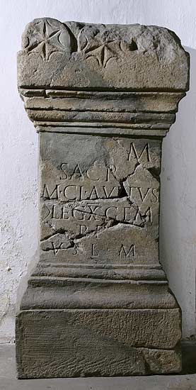 - I(ovi) o(ptimo) m(aximo) / sacr(um) / M(arcus) Cl(audius) Avitus / (centurio) leg(ionis) X gem(inae) / p(iae) f(idelis) / v(otum) s(olvit) l(ibens) m(erito)