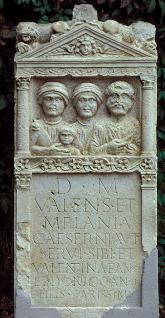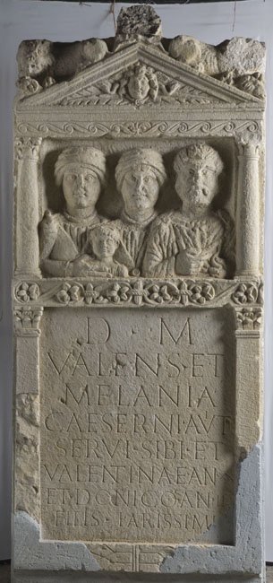 - D(is) M(anibus) / Valens et / Melania / Caeserni Aviti / servi sibi et / Valentinae an(norum) XX / et Donico an(norum) II / filiis karissimi[s]