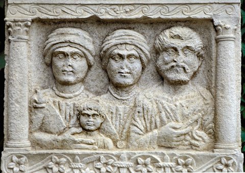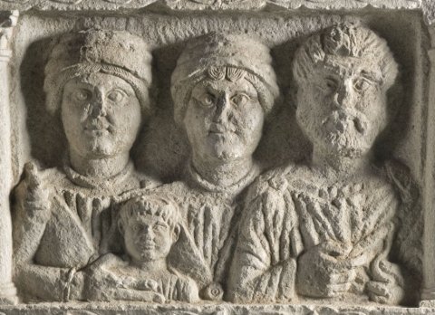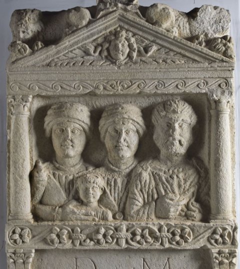 - Auf den Giebelschrägen liegende Löwen mit Widderköpfen in den Pranken. Zwischen ihnen abgebrochenes Mittelmotiv (Kopf ?). Im Giebelfeld Gorgoneion zwischen Blättern, unterhalb Zwischenfries mit Spiralranke. Hauptbild von glatten Säulen mit Blattkapitellen flankiert. Brustbilder einer Familie (Ehepaar mit erwachsener Tochter und kleinem Sohn) : links einheimische Frau mit Haube, Untergewand und Umhang, Halsreif, an der rechten Schulter große Kniefibel. In der Mitte ebenso gekleidete einheimische Frau (Tochter) mit Halsreif mit Lunula und Scheibenfibel, die den Umhang unter der Brust zusammenhält. Rechts bärtiger Mann mit Ärmeltunica und Mantel, in den Händen Peitsche. Vor den Frauen kleiner Knabe. Zwischenfries mit Blütenranke, darunter Inschrift, von glatten Pilastern mit Blattkapitellen gerahmt. Auf dem unteren Rahmen eingeritztes Schuppenmuster.