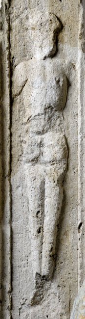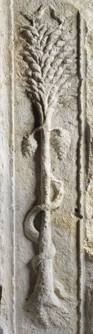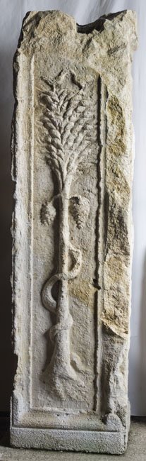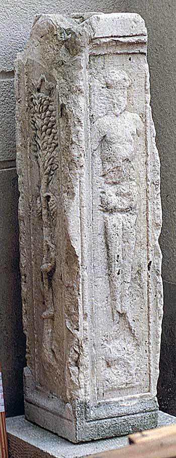 - Eckpilaster. Auf der Vorderseite schmales Feld mit Profilrahmen, darin frontal stehende nackte männliche Figur (Herme ?). Auf der linken Nebenseite Palme, auf der zwei Vögel sitzen und um deren Stamm sich eine Schlange windet.