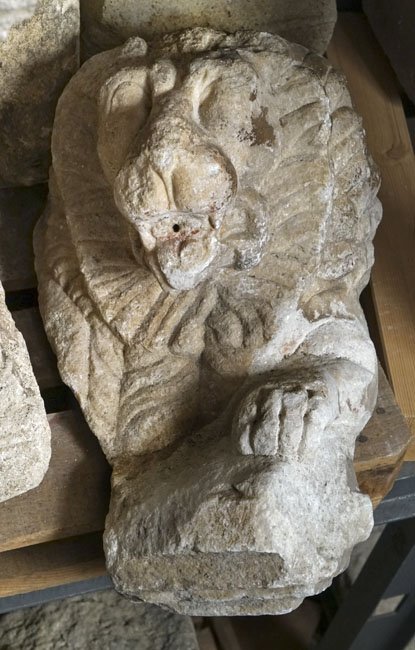 - Ciste zwischen Löwen : geflochtener zylindrischer Korb mit senkrechten und diagonal gekreuzten Streben, auf der Vorderseite bärtige Maske mit Tierohren, seitlich liegende Löwen (heute abgearbeitet).