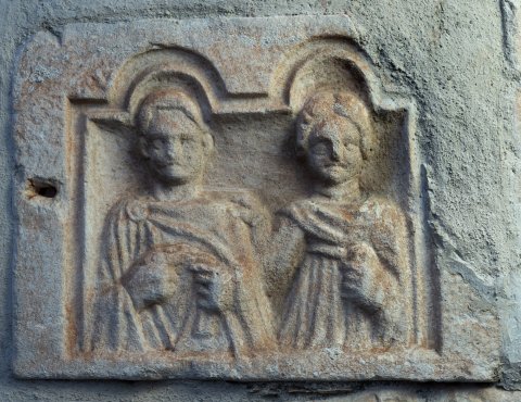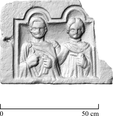 - In Nische mit Doppelbogen zwei Halbfiguren (Ehepaar). Links Mann: bärtig, Ärmeltunica, Sagum, Scheibenfibel, in der Linken Rolle (volumen). Rechts Frau: Mittelscheitel, gewelltes Haar, gegürtetes Gewand, Mantel, Halsreif mit Lunula, in der Rechten Apfel.