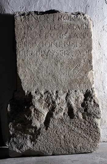 - [I(ovi) O(ptimo) M(aximo)] / [------] / [--- Au]/g[[[g]]](ustorum) nostrorum / tabul(arii) vectigal(is) Ill/yric(i) et vil(ici) stat(ionis) Po/etovionensis / Tertius ser(vus) ex voto