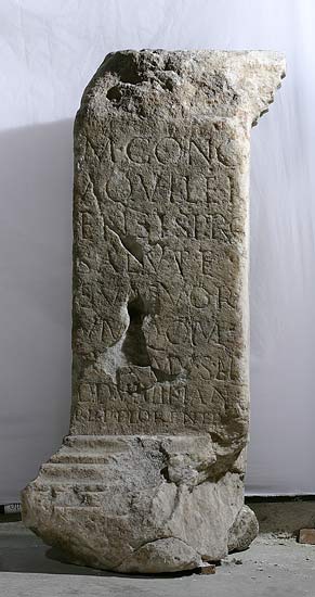 - [D(eo) I(nvicto) M(ithrae)] / M(arcus) Gong(ius) Aquilei/ensis pro / salute / sua suor/umq(ue) om/nium v(otum) s(olvit) l(ibens) m(erito) / d(ono) d(edit) VIIII K(alendas) Ian(uarias) / p(osuit) p(ater) p(atrum) Florentiu[s]
