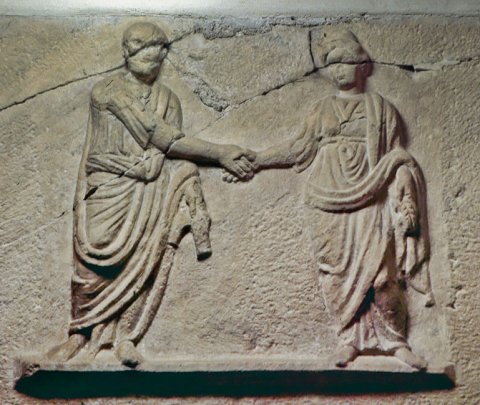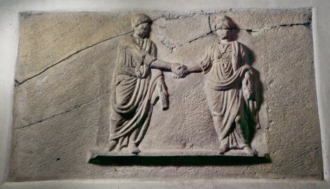 - Auf flacher Basisplatte zwei Ganzfiguren, Ehepaar, das sich die Hände reicht. Links Mann: lange Tunica, Toga. Rechts Frau: Frisur der Faustina Maior, gegürtetes Obergewand, Mantel.