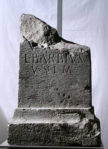 - Vi[ct(oriae?)] / L(ucius) Barbius / v(otum) s(olvit) l(ibens) m(erito)