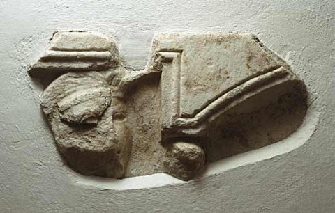 - Rahmen in der Mitte als flacher Bogen, links (wohl ebenso rechts) rechteckig. Links Rest eines weiblichen Kopfes mit Kopfschmuck und ausgehöhlten Augäpfeln (Theatermaske ?). Unter dem linken Bogenansatz kugelförmiges Objekt.