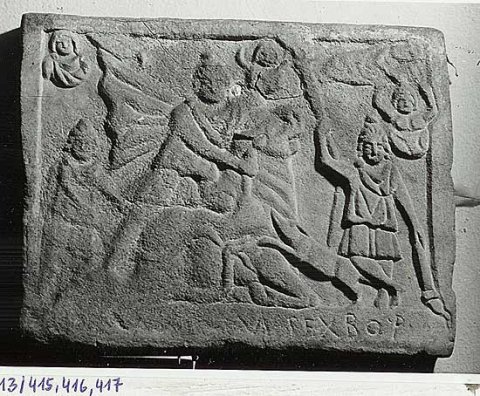 - Mythos (Mithras) : in einfach gerahmtem Rechteckfeld Stiertötung (Tauroktonie) mit Cautes und Cautopates, oben Büsten von Sol und Luna und Felsgeburt.