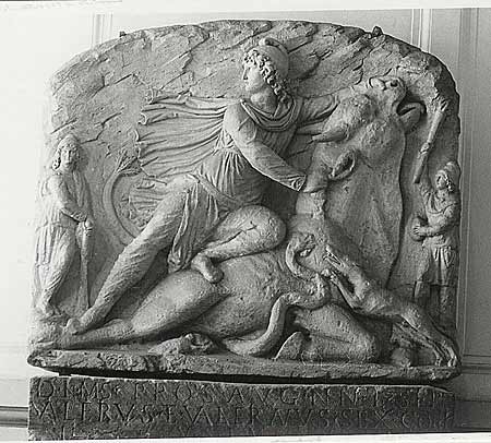 - Mythos (Mithras) : Stiertötung (Tauroktonie) mit Cautes und Cautopates.