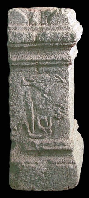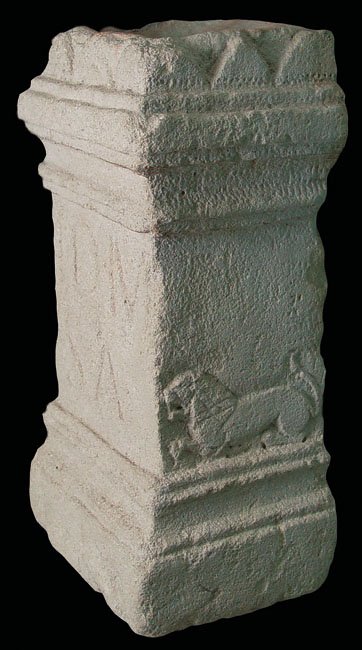 - Eckakrotere mit Palmetten, dazwischen gerahmter Giebel. Auf der Vorderkante der Deckplatte Ranke. Auf den Nebenseiten Tiere : links Rabe, Schlange und Kornähre, rechts liegender Löwe.