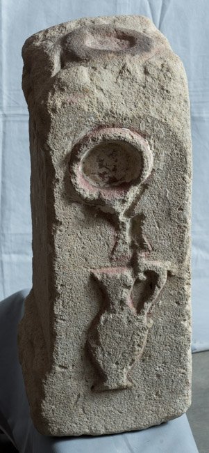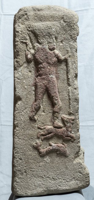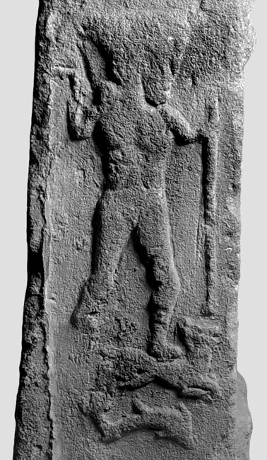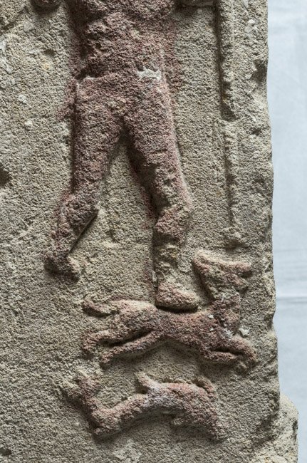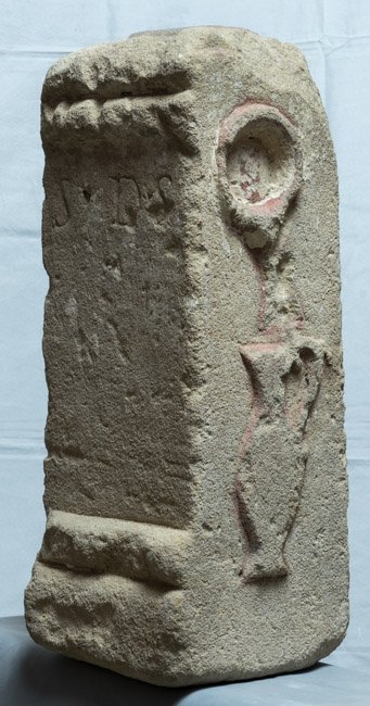 - Mythische Figur: Auf der linken Nebenseite nach rechts gehender nackter Silvanus, in der Linken langer Stock, in der Rechten Winzermesser. Vor den Füßen laufender Hund, unter diesem ein Delphin. Auf der rechten Nebenseite Gefäße (Kanne und Griffschale).