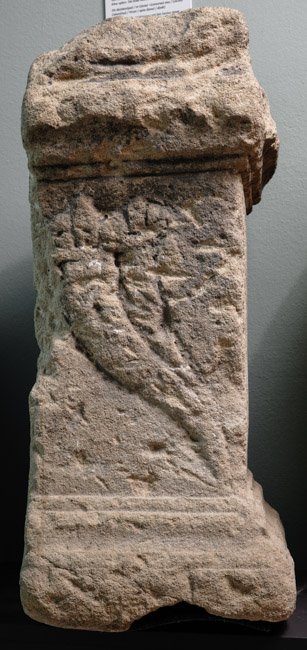 - Eckakrotere mit Palmetten. Auf der rechten Nebenseite stehender Genius: Mantel um die Hüften, Mauerkrone, im linken Arm Füllhorn, in der Rechten Patera. Auf der linken Nebenseite doppeltes Füllhhorn.