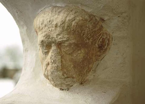 - In Giebelnische Porträtkopf eines Mannes: bartlos, trajanische Frisur. Teil eines Grabreliefs.