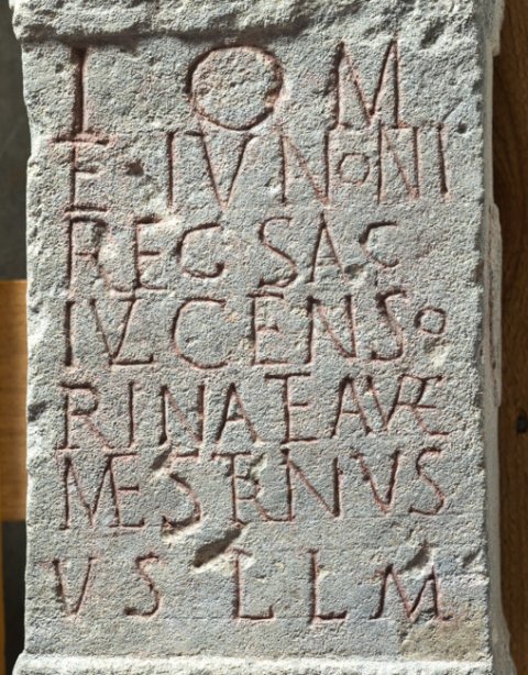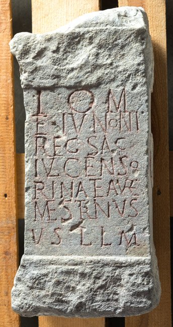 - I(ovi) o(ptimo) m(aximo) / et Iunoni / reg(inae) sac(rum) / Iul(ia) Censo/rina et Aure(lius) / Mestrinus / v(otum) s(olverunt) l(aeti) l(ibentes) m(erito)