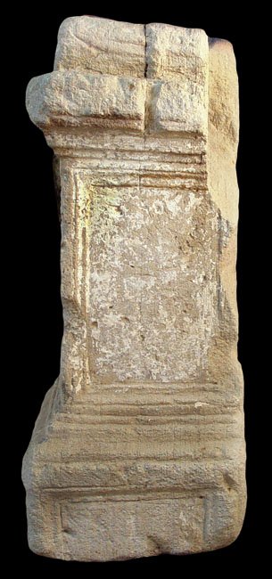 - Volutenpolster (pulvini) mit Rosetten, dazwischen kleiner Giebel mit Blattrosette. Schriftfeld und Nebenseiten gerahmt. Auf drei Seiten des Sockels profilierter Rahmen von einem älteren Denkmal.