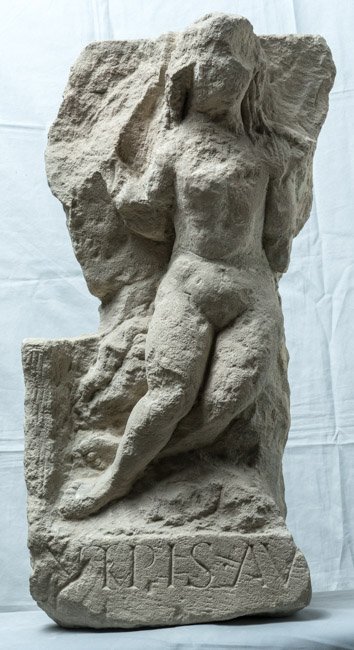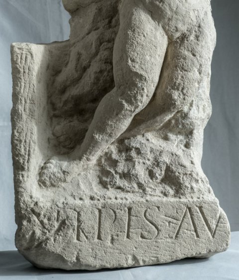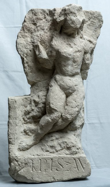 - Gerahmtes Bildfeld über der Inschrift. Mythische Figur (Nymphe): nackte weibliche Figur, Arme aufwärts angewinkelt, Beine schwebend gekreuzt.