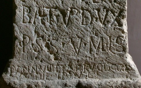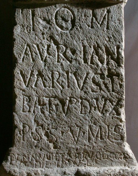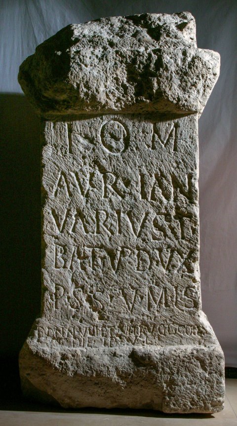 - I(ovi) O(ptimo) M(aximo) / Aur(elius) Ian/uarius t(ribunus) / Bat(avorum) v(ir) p(erfectissimus) dux / p(ro) s(alute) s(ua) v(otum) m(erito) l(ibens) s(olvit) // dd(ominis) nn(ostris) VIII et VII Augg(ustis) co(n)ss(ulibus) / die Id(uum) Iul(iorum)