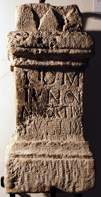 - I(ovi) o(ptimo) m(aximo) / Iunon(i) / Aur(elius) Tertius / t(itulum) v(otum) s(olvit) l(ibens) m(erito)