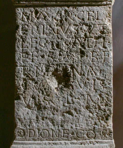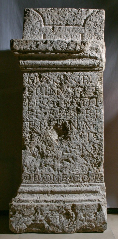 - I(ovi) o(ptimo) m(aximo) / M(arcus) Aur(elius) Cel/erinus vet(eranus) leg(ionis) adi(utricis) / p(iae) f(idelis) Se[ver(ianae) ] b(ene)f(iciarius) / trib(uni) una / cum suis / v(otum) s(olvit) l(ibens) m(erito) / [[Imp(eratore) Caes(are) M(arco) Aur(elio) S/evero Alexandr]]/o (et) Dione co(n)s(ulibus)