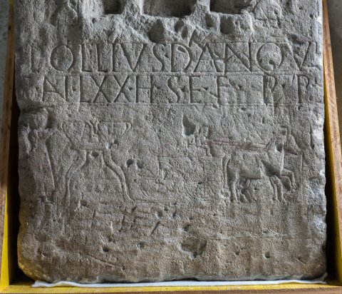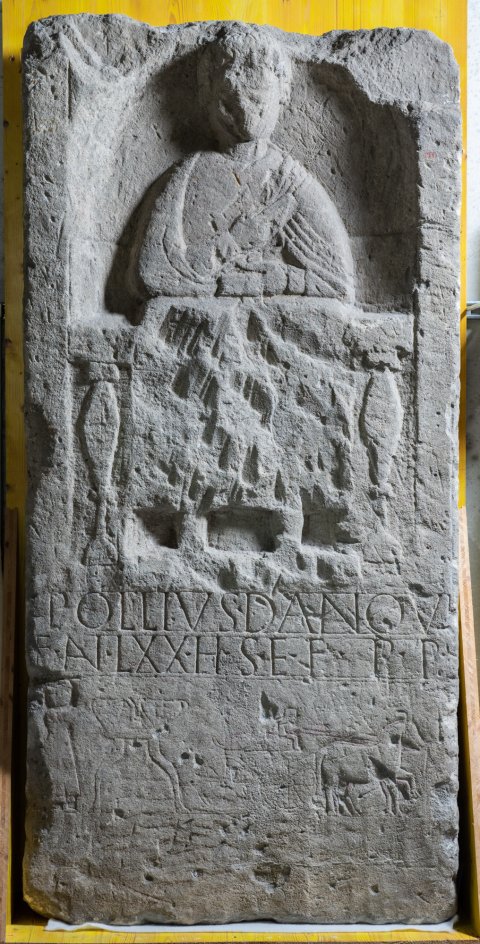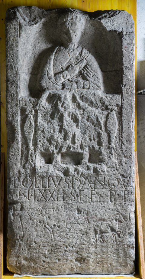 - Pollius Danovi / f(ilius) an(norum) LXX h(ic) s(itus) e(st) f(ilius oder filii) p(atri) p(osuit oder posuerunt)