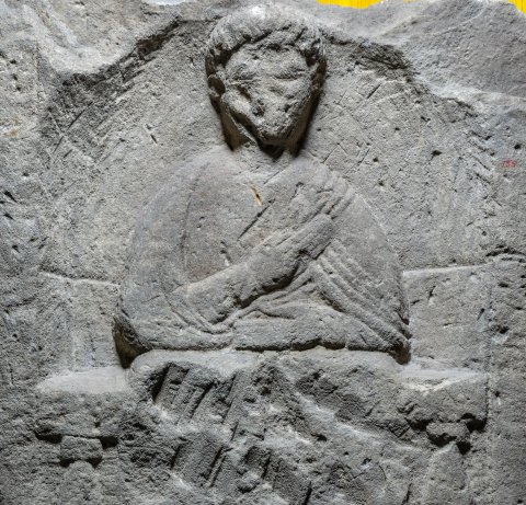 Im Hauptbild Bogennische mit Ganzfigur eines sitzenden Mannes (bartlos, Ärmeltunica, Mantel) auf Stuhl mit gedrechselten Beinen.