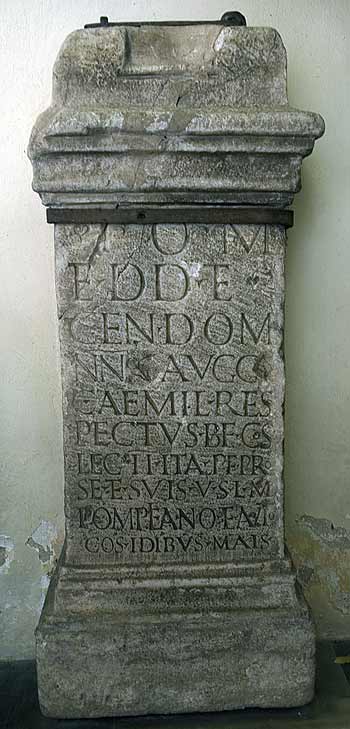 - I(ovi) o(ptimo) m(aximo) / et d/is) d(eabusque) et / gen(io) Ddom(inorum) / nn(ostrorum) Augg(ustorum) / C(aius) Aemil(ius) Res/pectus b(ene)f(iciarius) c0(n)s(ularis) / leg(ionis) II Ital(icae) p(iae) f(idelis) pro / se et suis v(otum) s(olvit) l(ibens) m(erito) / Pompeiano et Avito / co(n)s(ulibus) Idibus Mais