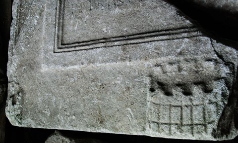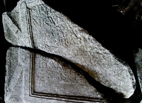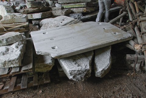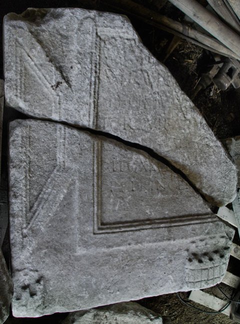 - 2 Fragmente der linken Hälfte, stark verwittert (ursprünglich 9 Fragmente)