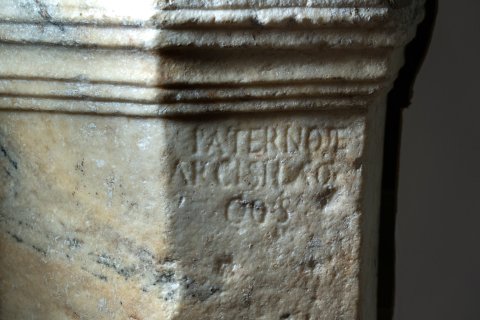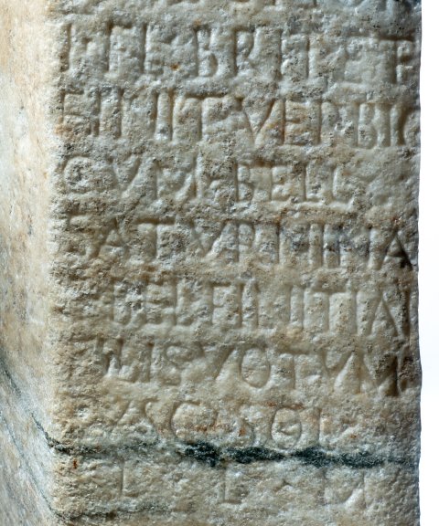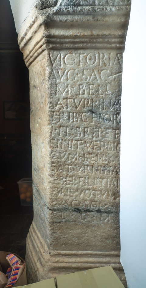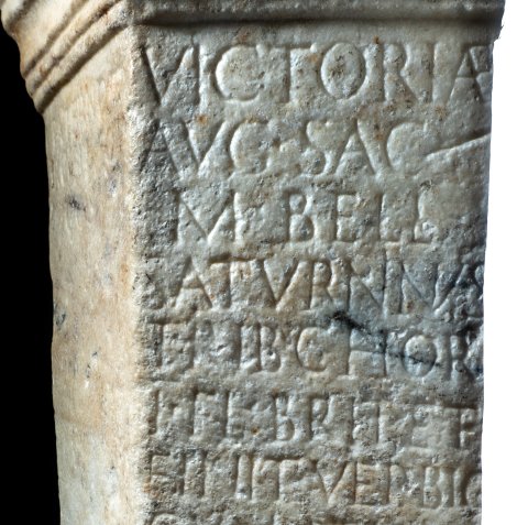 - Victoriae / Aug(ustae) sac(rum) / M(arcus) Bell(icius) / Saturninus / trib(unus) c(o)hor(tis) / I Fl(aviae) Brit(tonum) et / Finit(ia) Verbic(ia) / cum Bell(icia) / Saturnina / et Bel(licio) Finitian(o) / fili(i)s votum / susc(eptum) sol(verunt) l(aeti) l(ibentes) m(erito) // Paterno et / Arcesilao / co(n)s(ulibus)