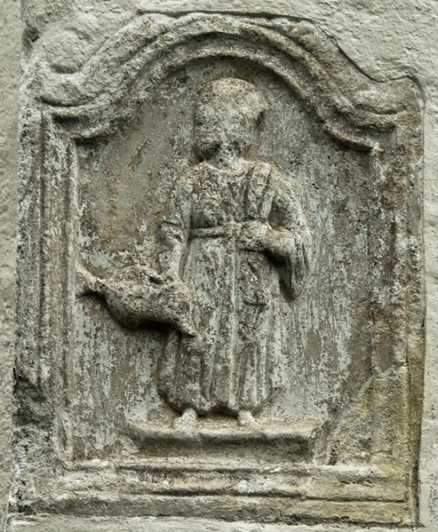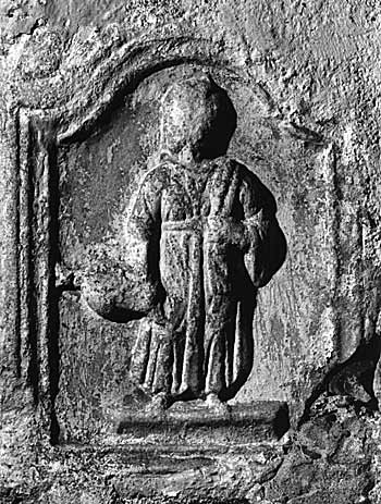 - Dienerin: in Bogennische auf flachem Podest einheimisches Mädchen in langem, gegürtetem Ärmelgewand, in der Rechten Kanne, über der linken Schulter mappa.