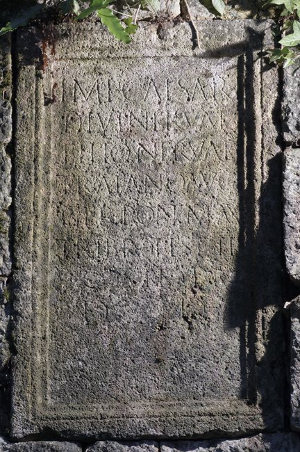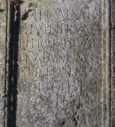 - Imp(eratori) Caesari / divi Nervae / filio Nervae / Traiano Aug(usto) / Ger(manico) pont(ifici) max(imo) / trib(unicia) potest(ate) II / co(n)s(uli) II p(atri) p(atriae) / d(ecreto) d(ecurionum)