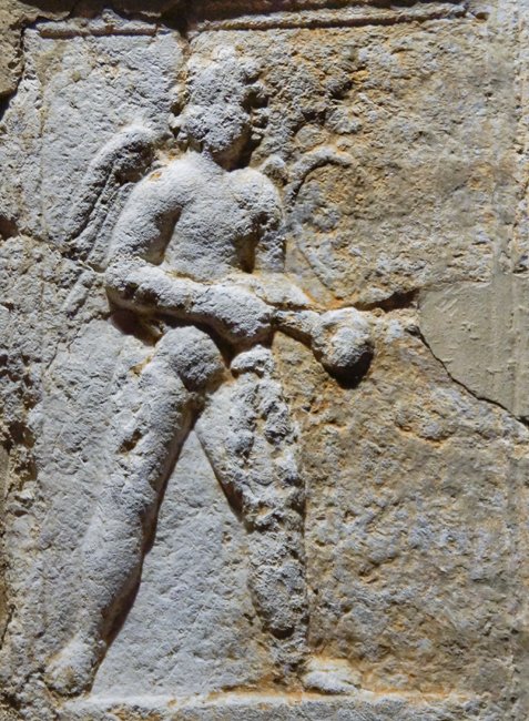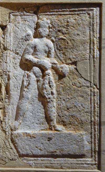 - Auf niedriger Sockelzone ausschreitender nackter geflügelter Knabe (Genius, Erot), in der Rechten Kranz, in der Linken Pedum (?).