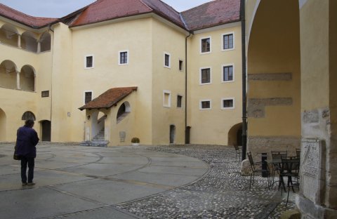 - im Hof des Schlosses, links der mittleren Treppe