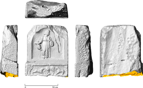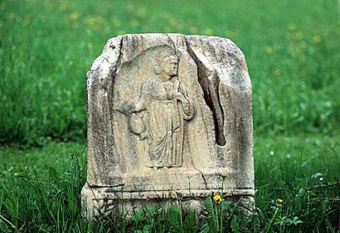 - Dienerin, Tiere: in Bogenfeld einheimisches Mädchen in gegürtetem Ärmelgewand, in der Rechten Kanne, über der linken Schulter mappa. Auf dem Sockel Fries mit Wildschwein zwischen zwei Hunden, seitlich je ein Baum.