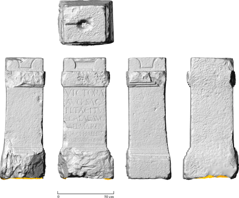- Victoriae / Aug(ustae) sac(rum) / Fl(avius) Tacitus / s(ummus) c(urator) alae Aug(ustae) / Ael(ius) Martius / s(ummus) c(urator) coh(ortis I Ael(iae) Brit(tonum) / pro se suisq(ue) omnibus / v(otum) s(olverunt) l(ibentes) l(aeti) m(erito) Kal(endis) Febr(uariis) Pio et Pontiano / co(n)s(ulibus)