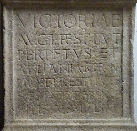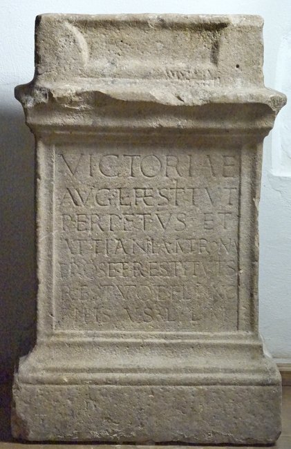 - Victoriae / Aug(ustae) L(ucius) Restitut(ius) / Perpetus et / Attiania Matrona / pro se et Restituti(i)s / Restuto et Florino / fili(i)s v(otum) s(olverunt) l(ibentes) l(aeti) m(erito)